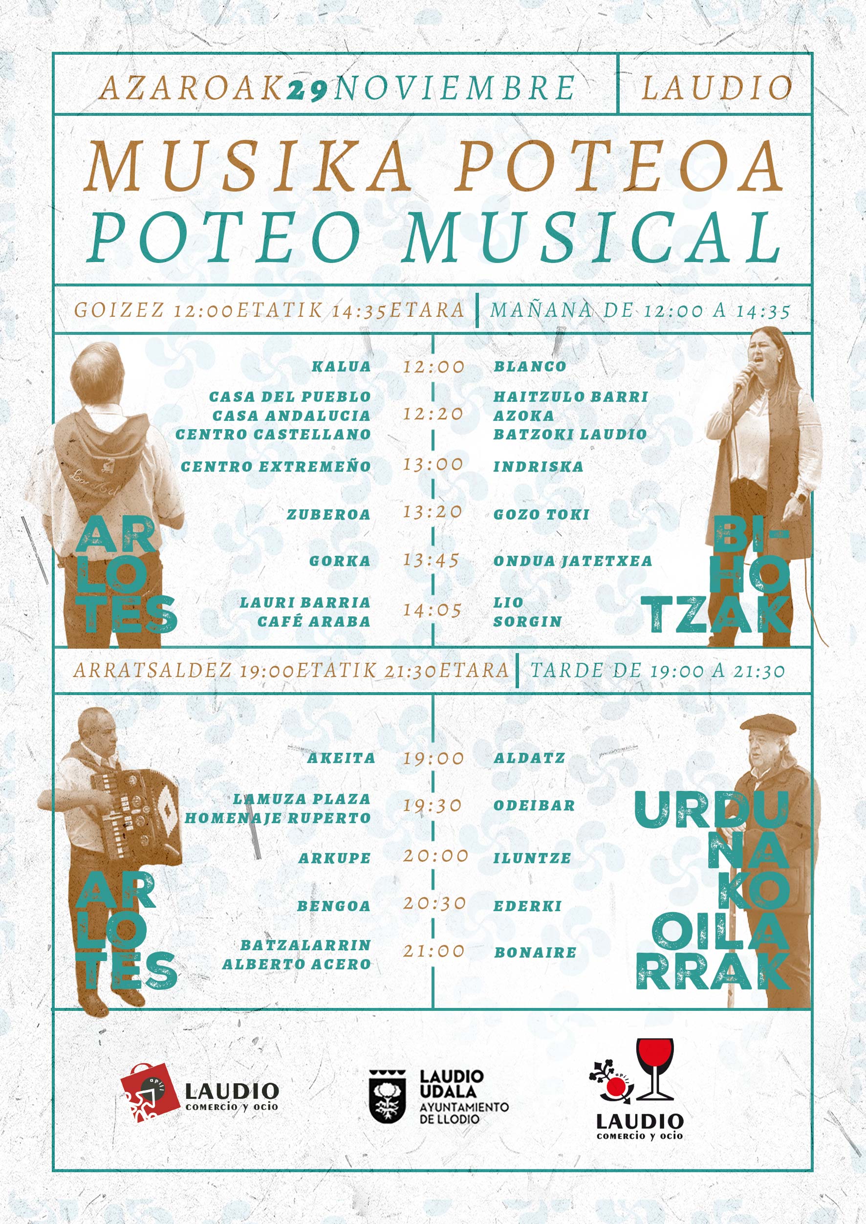 Por un lado, desde la Asociación hemos organizado una kalejira con el formato de “poteo musical” por diferentes lugares del municipio, donde contaremos con los Arlotes, Urduñako Oilarrak y la Coral Bi Hotzak que animarán mañana y tarde nuestras calles. Esta acción cuenta con el patrocinio del Ayuntamiento de Llodio.