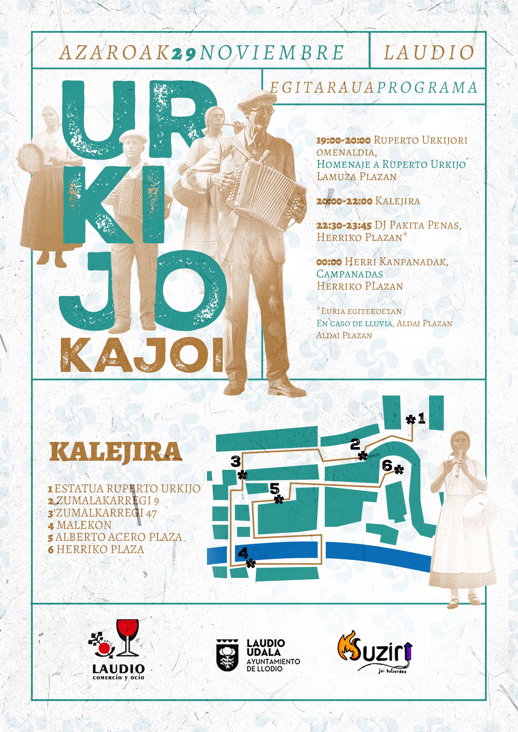Por otro lado, Suziri Jai Batzordek ha recuperado para este último sábado de noviembre Urkijo Kajoi. Desde aquí queremos invitar a todos y todas las laudioarras a hacer grande ese día. Para ello condición indispensable será vestirse de etiqueta y participar en los actos programados.